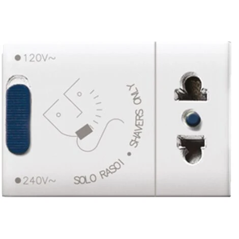 Presa per rasoi, Serie Domus colore RAL9010, con trasformatore di isolamento 20VA – standard euroamericano – alimentazione 230V~ – tensione prelevabile in uscita selezionabile tramite commutatore 240V~ o 120V~ – alveoli schermati – 3 moduli