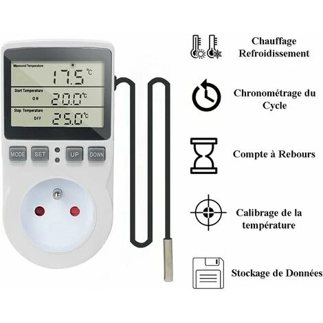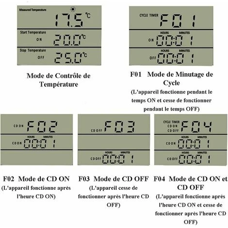 Ce thermostat avec minuterie peut contrôler automatiquement l’interrupteur des équipements de réfrigération et de chauffage, et a la fonction de contrôle intelligent de la température et de synchronisation intelligente.